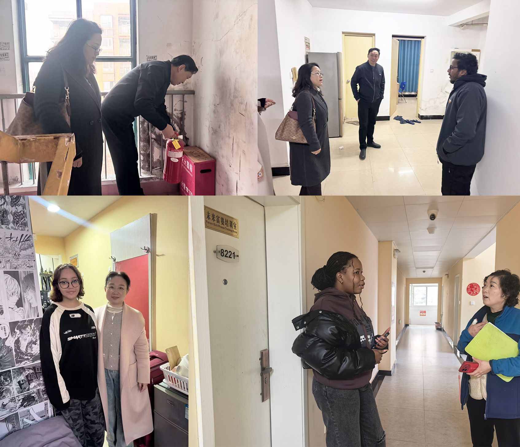 为切实履行国际学生管理服务主体责任,保障国际学子校园居住安全与稳定,严格落实学校安全工作整体部署,11月21日下午,我院联合校保卫处,组织开展留学生宿舍冬季安全专项大检查。国际教育学院院长刘玉君、保卫处副处长赵宏、副院长于敏、全体辅导员与班主任共同参与,深入枚乘路校区、北京路校区各留学生宿舍,开展“全覆盖、零死角、无遗漏”的安全隐患排查工作。