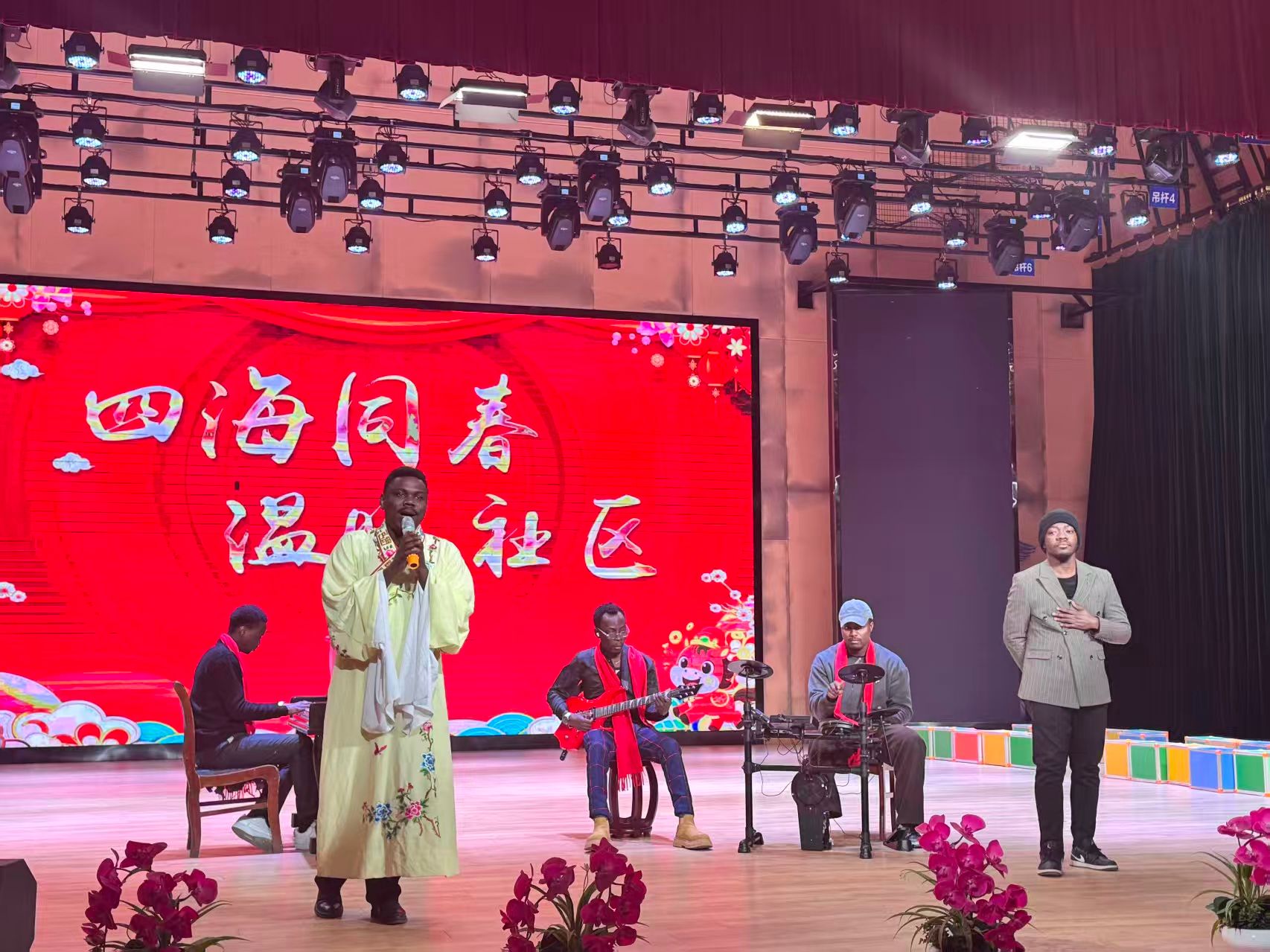 下午,中外学生与三门社区居民共同参与文艺展演。留学生们换上精美戏服,登台表演,沉浸式感受传统戏曲魅力;在民间艺人指导下,大家学习甩龙技艺,彩龙翻飞、活力满满,尽显民间手艺的灵动趣味。活动最后,留学生们共同演唱《新年好》,用中文送上新春祝福。
