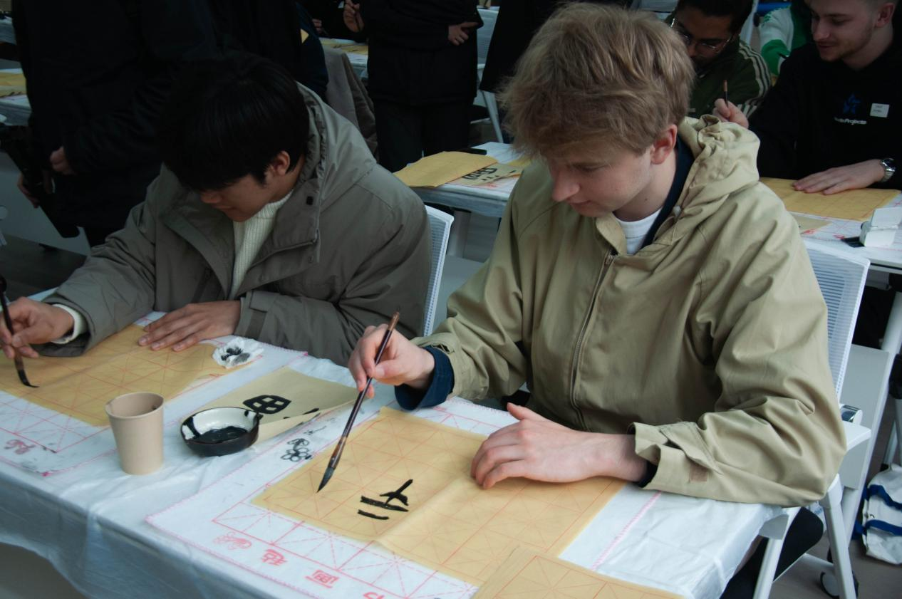 随后,代表团成员参与了学院书法工作坊特色活动。姚旭荣老师主持本次活动,讲解了中国书法的悠久历史与发展传承,重点解读了“福”字所承载的美好寓意与文化内涵。在姚老师的耐心指导下,代表团成员认真学习握笔、运笔技巧,练习书写“福”字,中外学生搭配而坐相互交流,沉浸式体验中国书法的独特魅力。